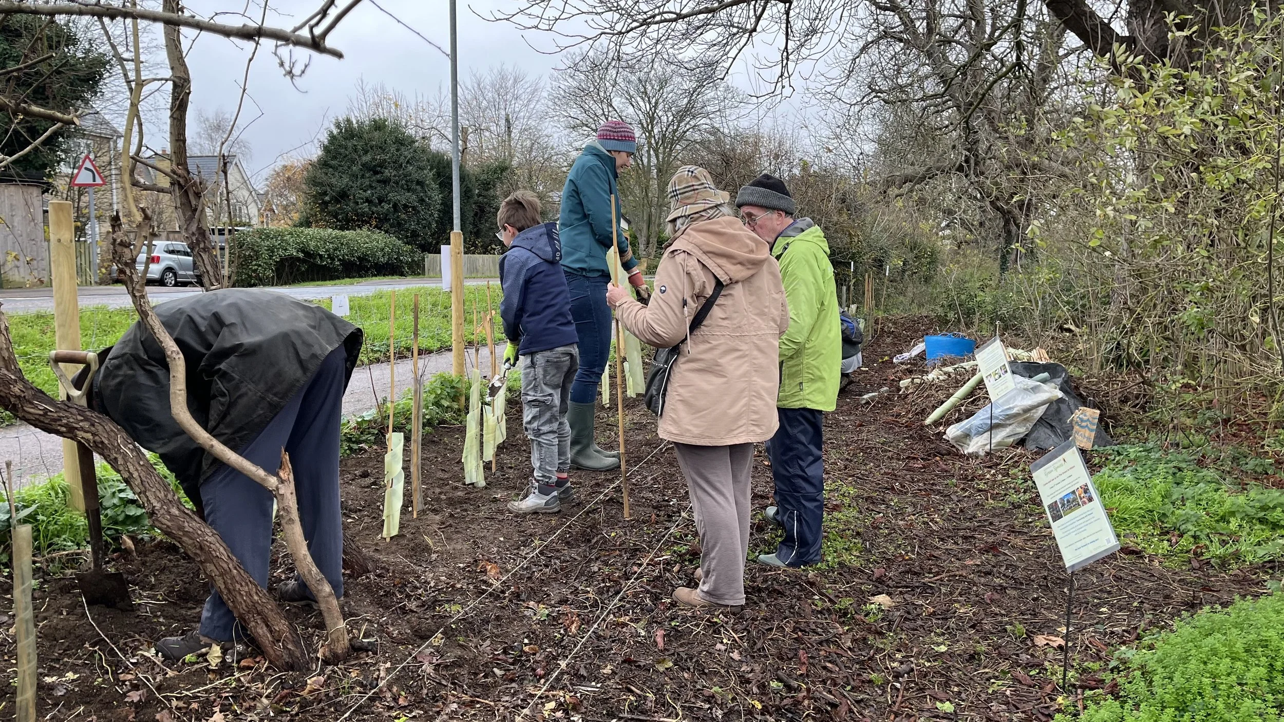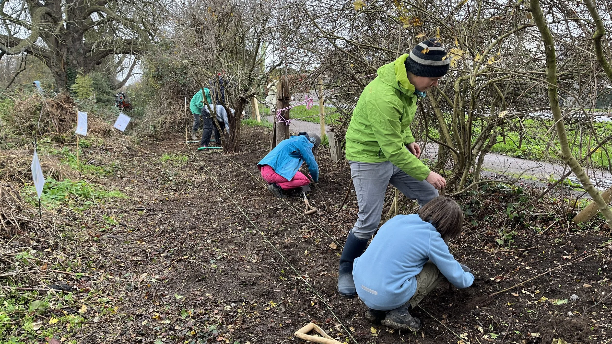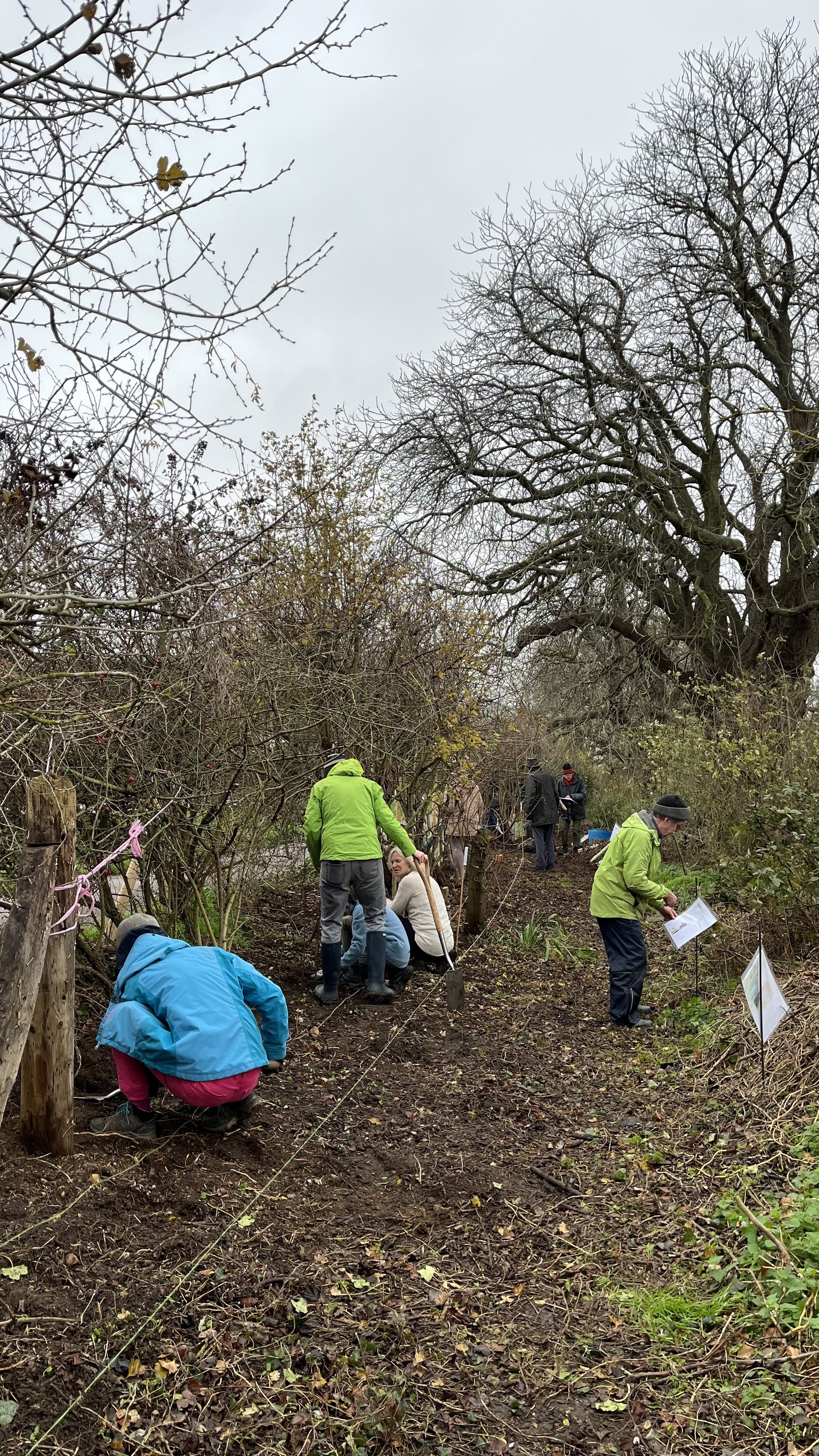 Despite the threat of rain looming through the morning, a host of 30 young and not-so-young enthusiasts turned out to plant around 200 saplings (or ‘whips’) in the Park Lane hedge. The mix of all-native species comprised field maple, dogwood, spindle, guelder rose, privet and hazel. We also planted some holly in the shadier areas and a few hawthorn whips to add to the existing hawthorns. These old hawthorns were all that remained of the existing hedge once the 30m stretch opposite Melvin Way had been cleared of the brambles and ivy which had overwhelmed the original hedging here.